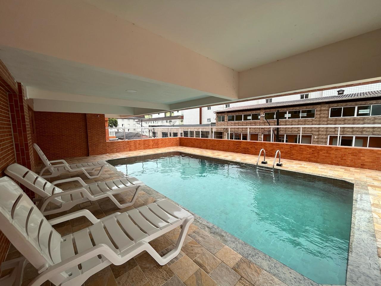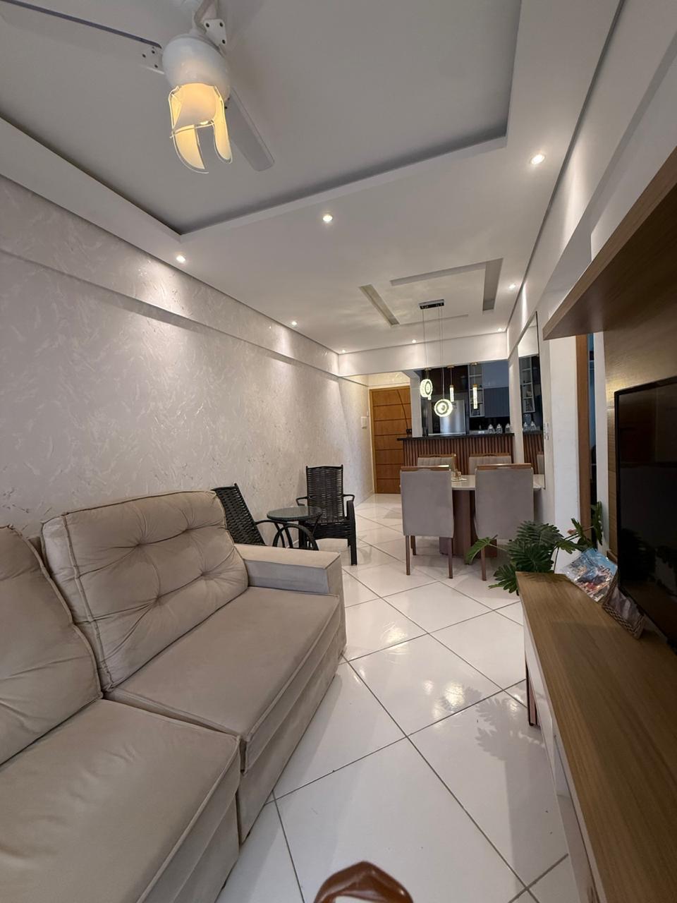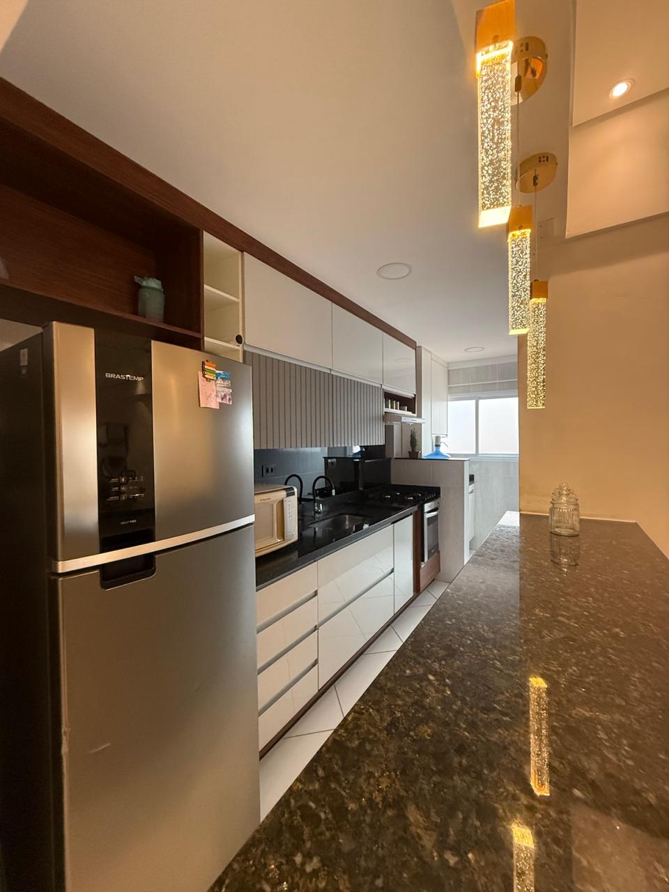 Apartamento completamente reformado a 180 metros da praia , com 02 Dormitórios, 02 banheiros, sala integrada com a cozinha, área de serviço, varanda, posicionado para os fundos, móveis planejados tanto na cozinha como nos quartos, piso no porcelanato, box de vidro.